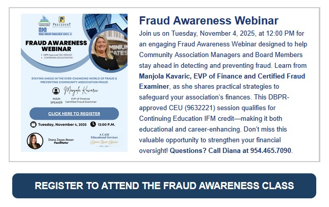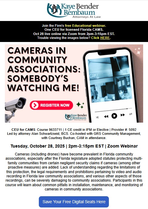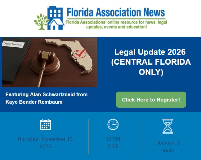 The webinar offers two (2) Legal CEUs for licensed Florida CAMS and also satisfies the annual Legal CEU requirement for Florida Condominium Board Members.