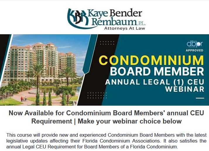 The webinar offers two (2) Legal CEUs for licensed Florida CAMS and also satisfies the annual Legal CEU requirement for Florida Condominium Board Members.