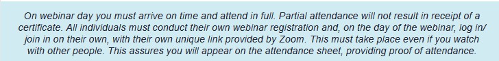 Arriving after the start time may NOT result in receiving a Certificate, certification(s) or CEUs.